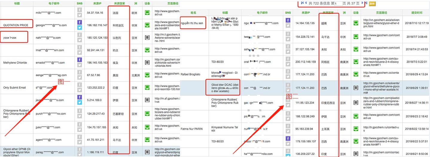 圖一中很多采購商習(xí)慣用母語訪問并發(fā)送詢盤;圖二總詢盤722個,很多非英語國家?guī)淼牧髁哭D(zhuǎn)化的詢盤;