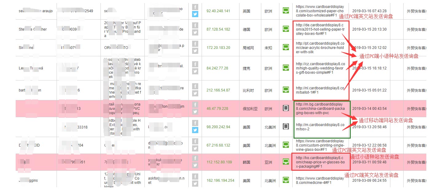 以下截圖為該客戶的部分詢盤,發(fā)現(xiàn)采購商通過小語種網(wǎng)站發(fā)送詢盤的占50%,采購商通過移動端站發(fā)送詢盤占20%,通過英文主站發(fā)送詢盤占30%,意味著,如果只做英文站的推廣,你將會損失掉70%的潛在客戶!
